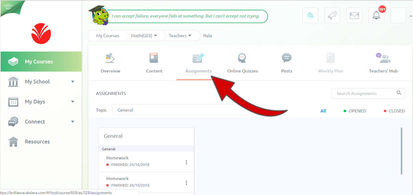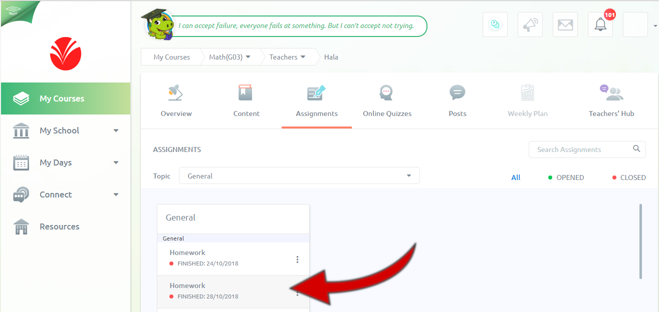 (Note that finished homework has a red dot next to it, while homework that is still due should have a green one)