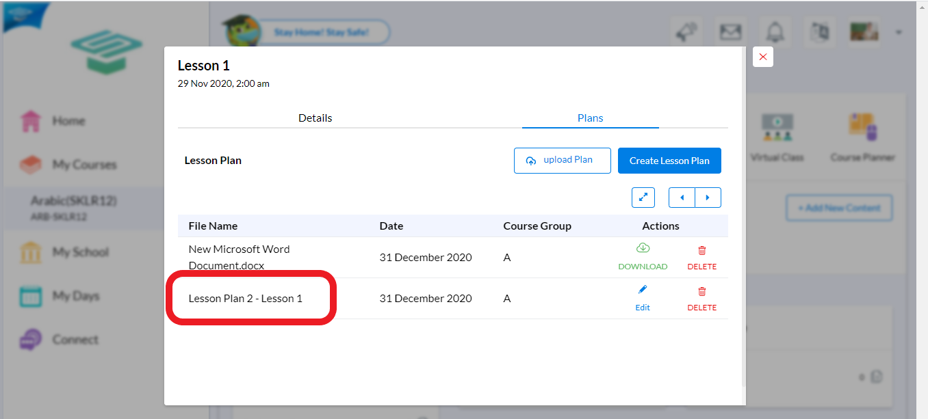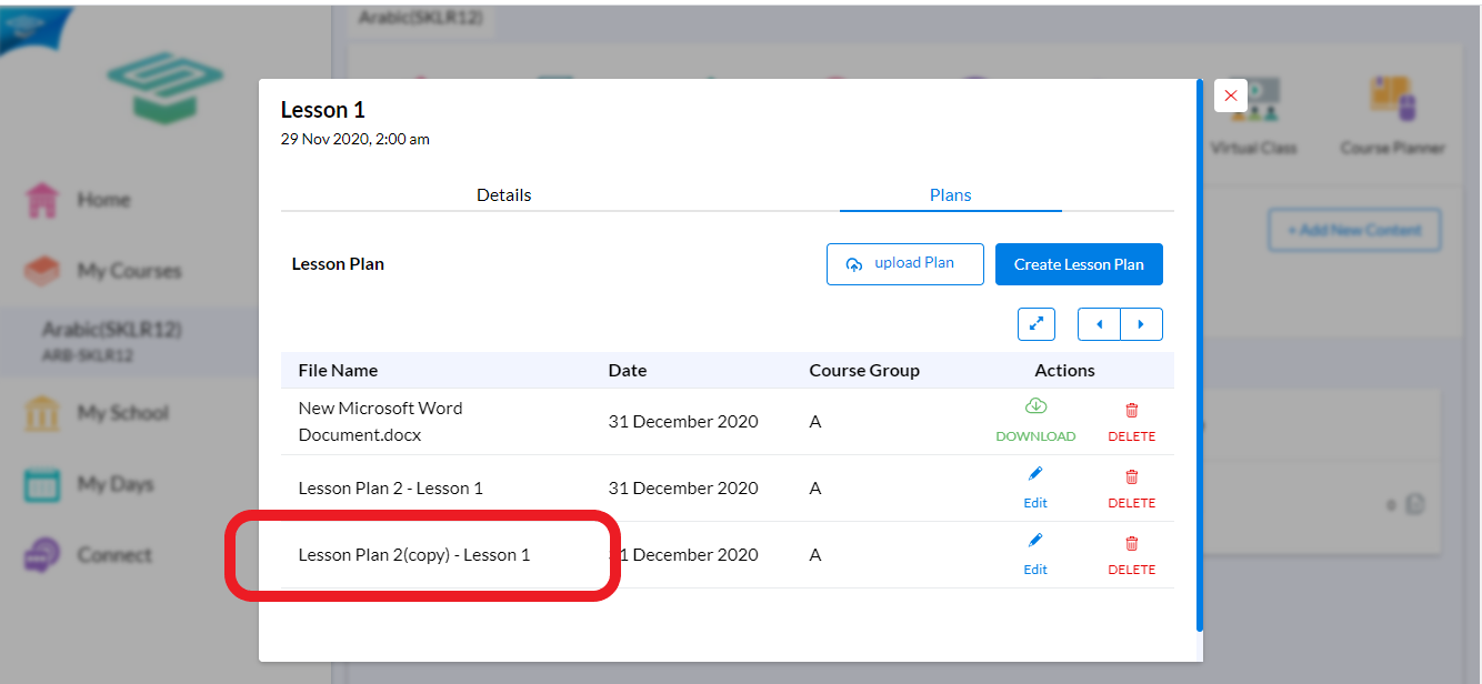 5.Click on the Lesson name Press the <Plans> tab, You will find all the plans you created previously for that lesson and beside each plan, two buttons, one to <Edit> and the Other to <Delete>