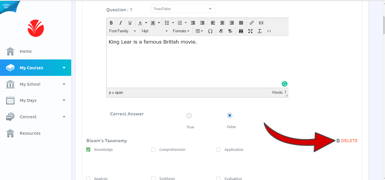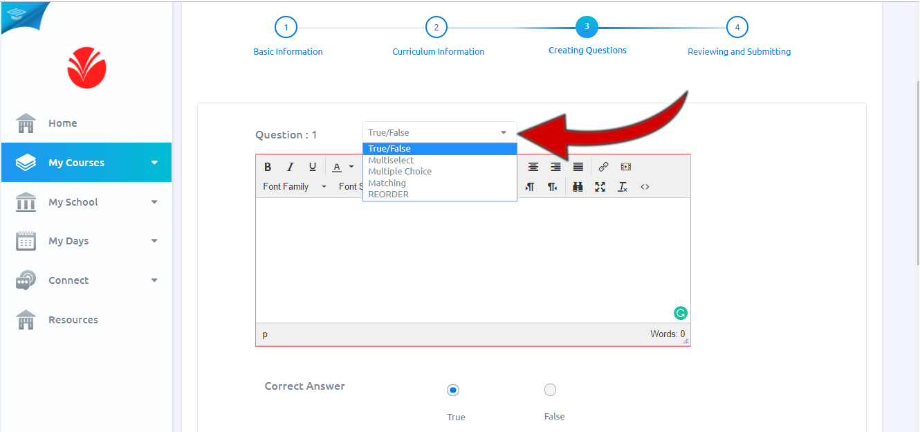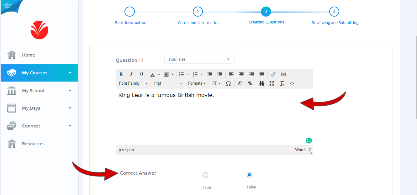 2. Type your question in the text box and choose whether the answer to this question is True or False by checking the appropriate circle.
