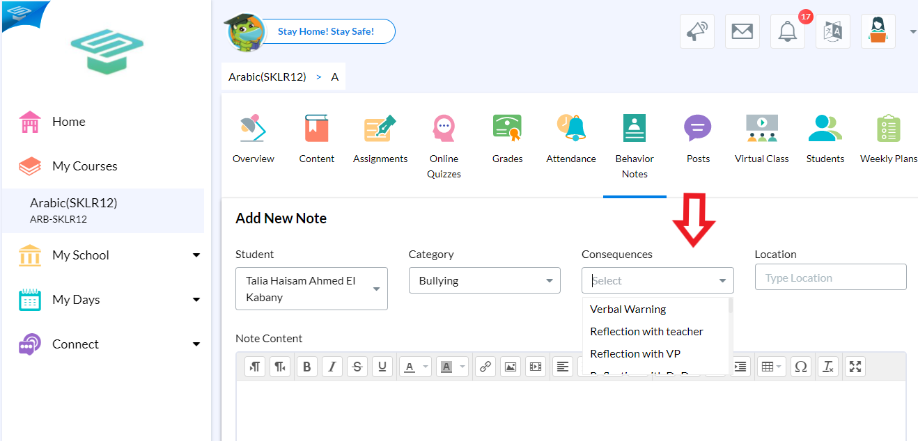 8.Select the Consequences you want to comment on the student's behavior from the Consequences drop-down menu