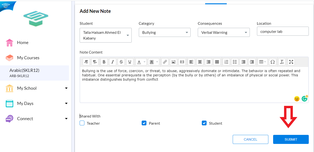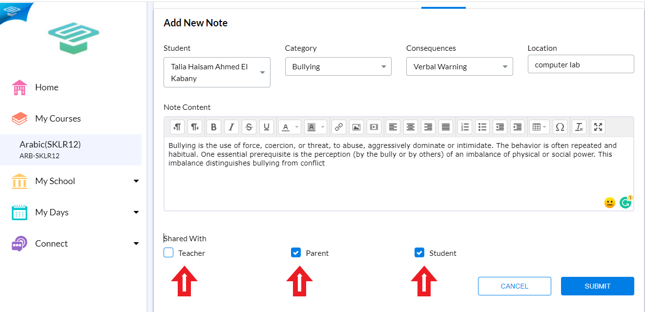 Selecting Parent will share the note with the student's parent.