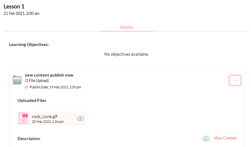 6. From this pop-up , after pressing on the arrow found at the right side of the Content Name, you will be able to Download a certain file by clicking the cloud button, or View the Content Online by pressing on View Content