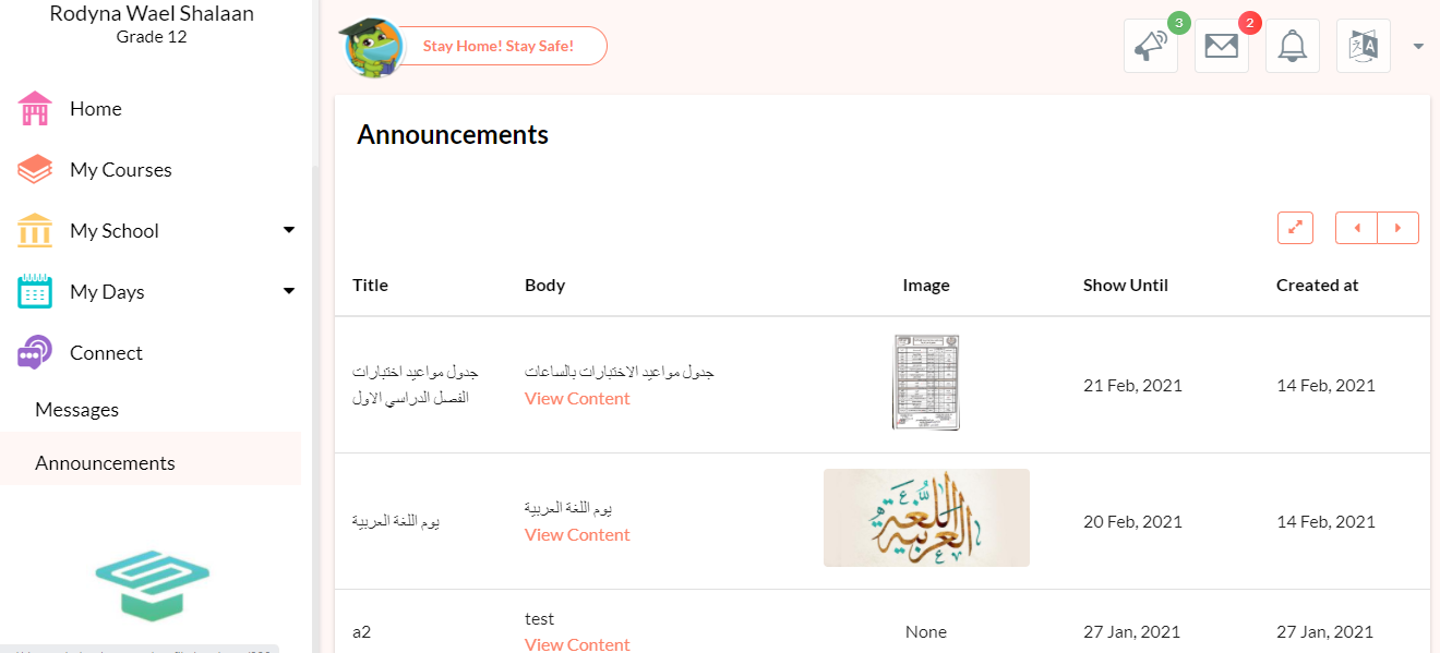 - 1st : to press on the announcements icon at the top right side for the RECENT memos sent to you and by clicking on <Read more>under the announcement title, you will be directed to the announcement page to see full details.