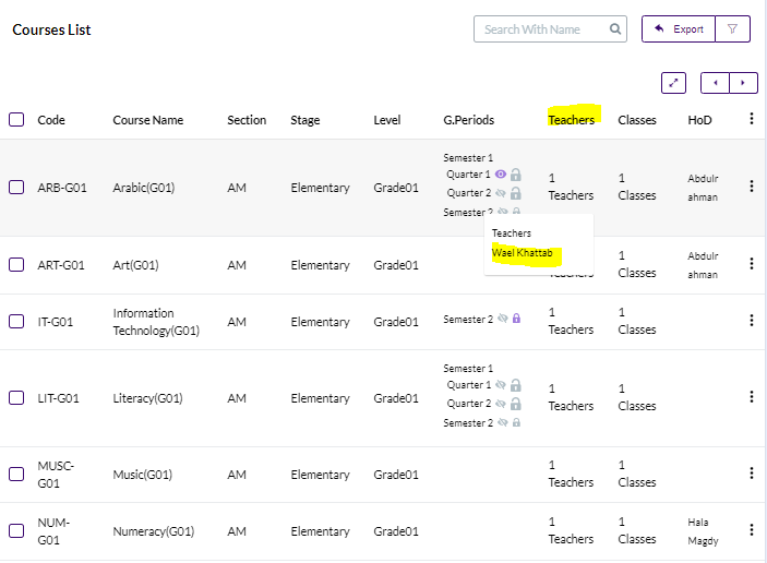 Press on the Number of Teachers assigned to the required Course to View the Teachers names