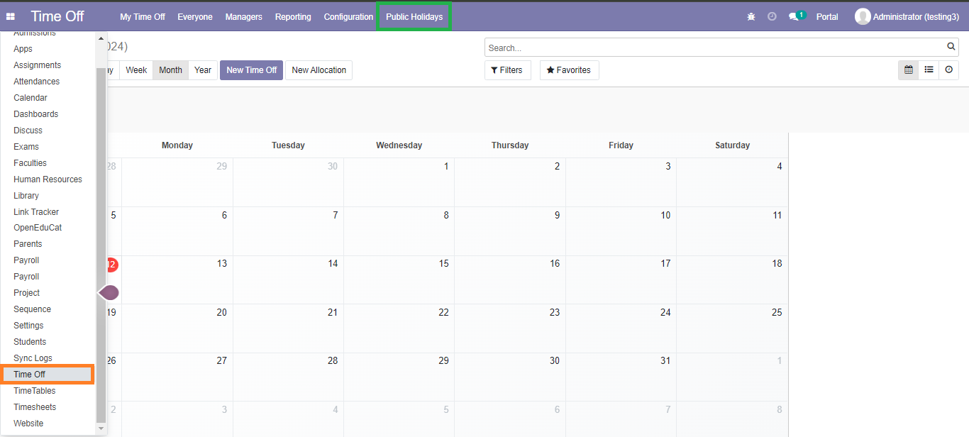 - Log into your ERP dashboard and open the Time Off module. This module is central to managing all aspects of employee leaves, including public holidays, annual leaves, and special leaves.