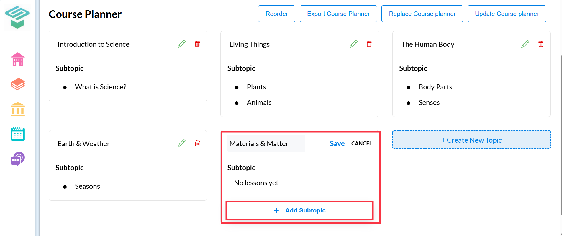 On the Course Planner page, you’ll see a list of existing topics and subtopics (if added earlier).