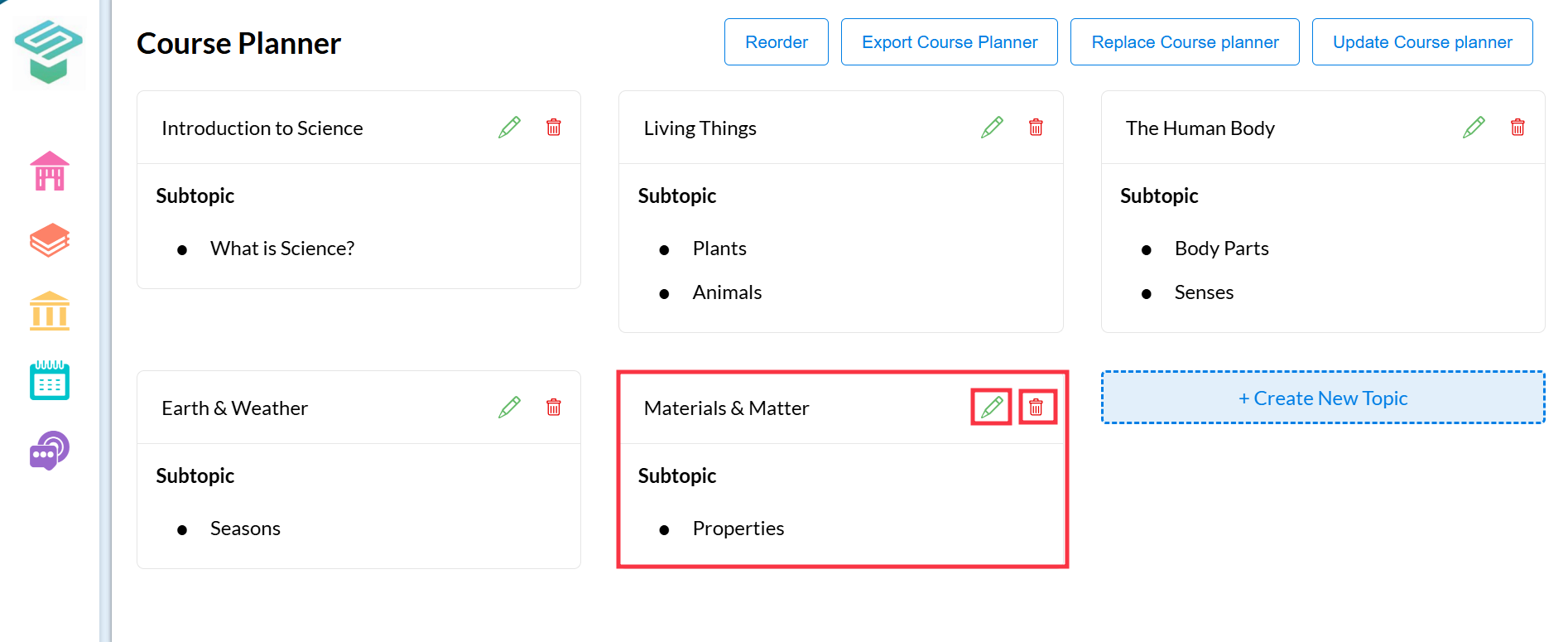 You can edit or delete any topic, subtopic, or lesson using the following icons:
