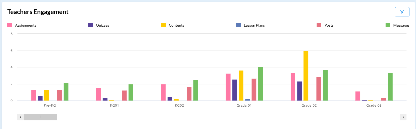 Shows the average contribution per teacher for each Grade/Level in Assignments, Quizzes, Content, Lesson Plans, Posts and Messages.