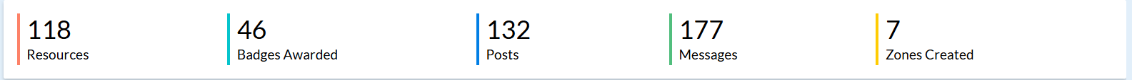 Shows the number of resources (Content) uploaded , Badges awarded to students , Posts created , Messages sent and Zones created .