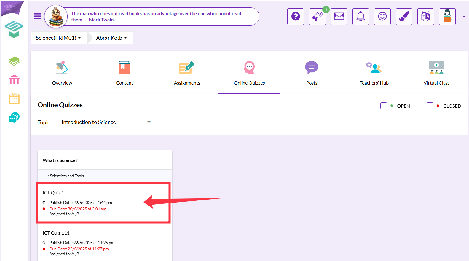 (Note that finished quizzes have red dots next to them, while due quizzes have a green dot.)