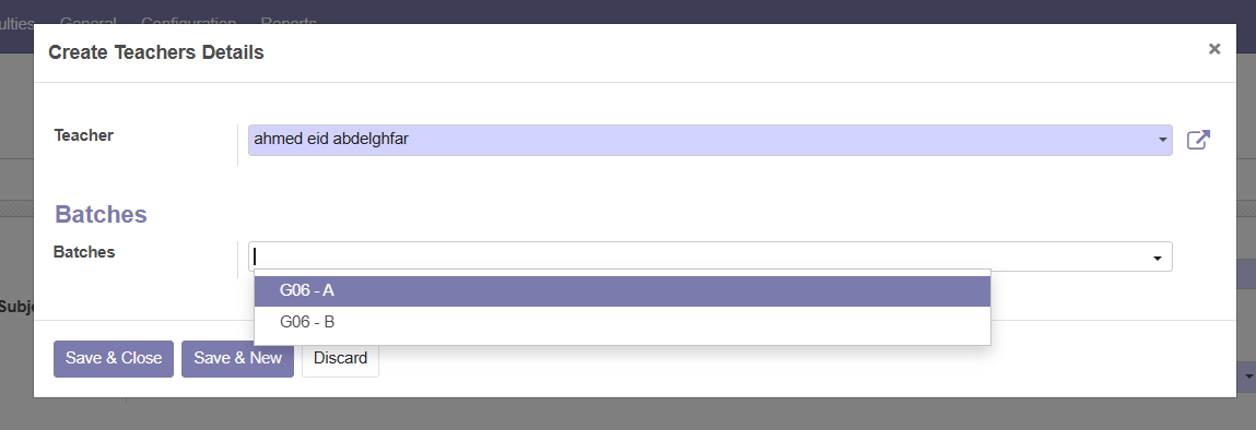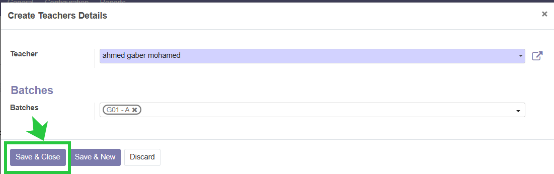 Step 9 : When the 'Create Teacher Details' window appears, select the teacher and assign the Batches they will be responsible for.