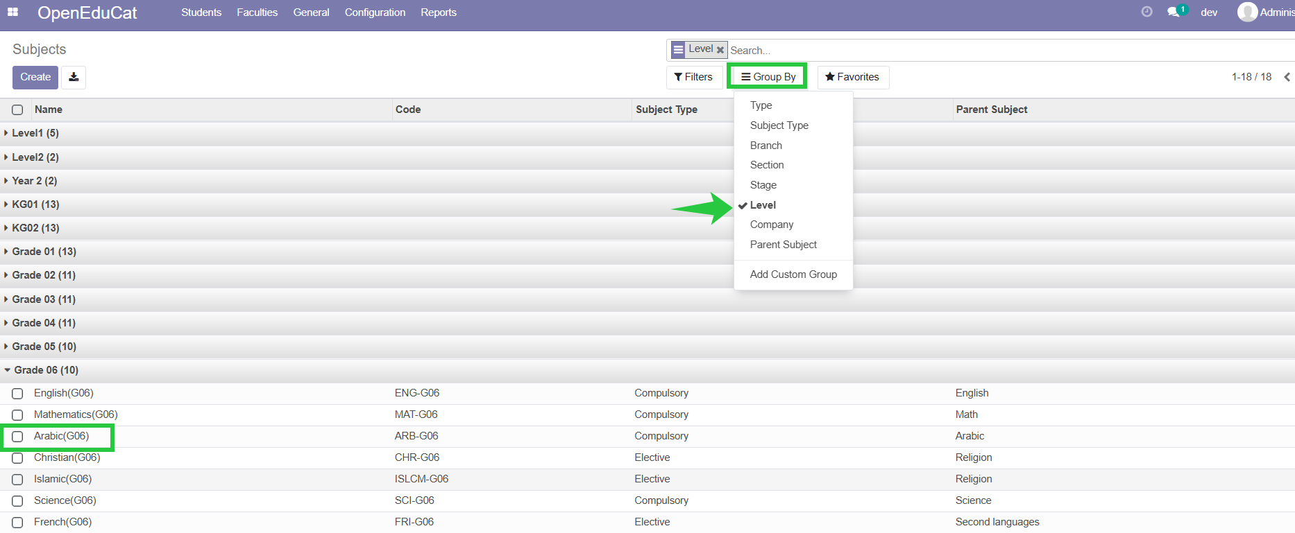 4. To make it easier to find subjects you need, click on Group by, then select level.