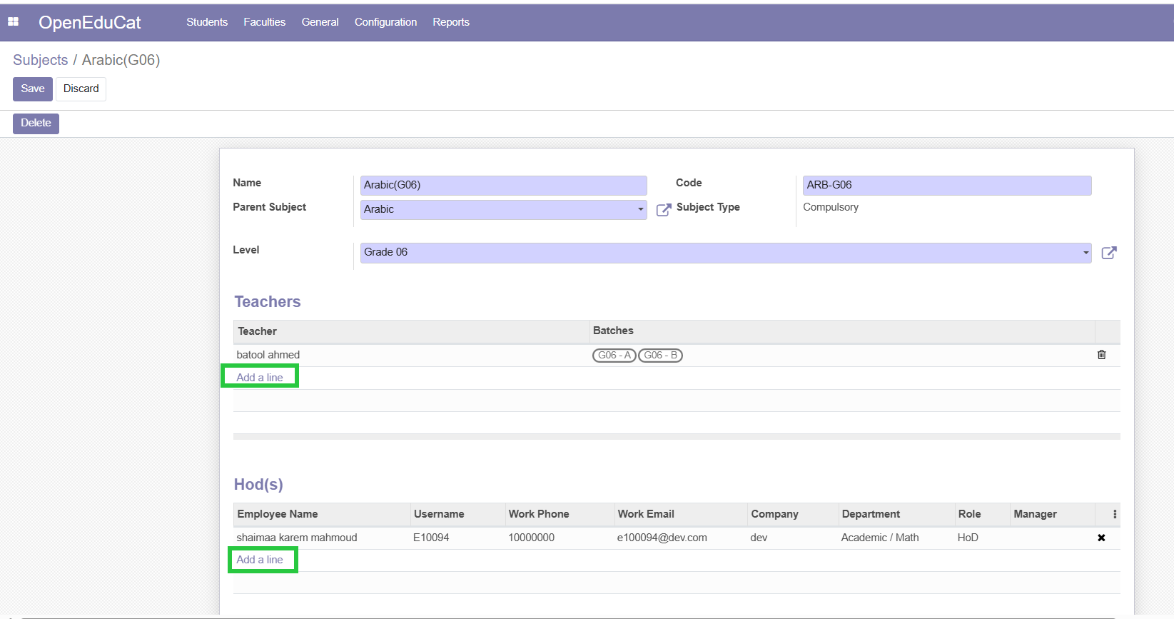 8. Click on the "Add a line" button to begin the process of assigning Teachers / Heads of Departments (HODs)