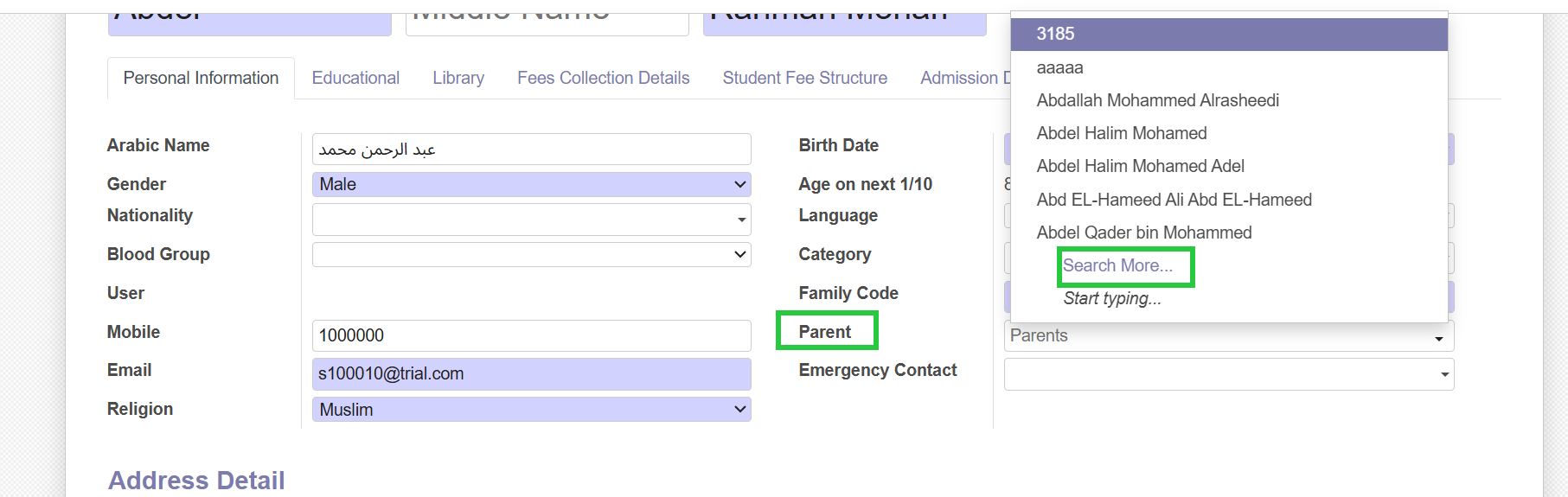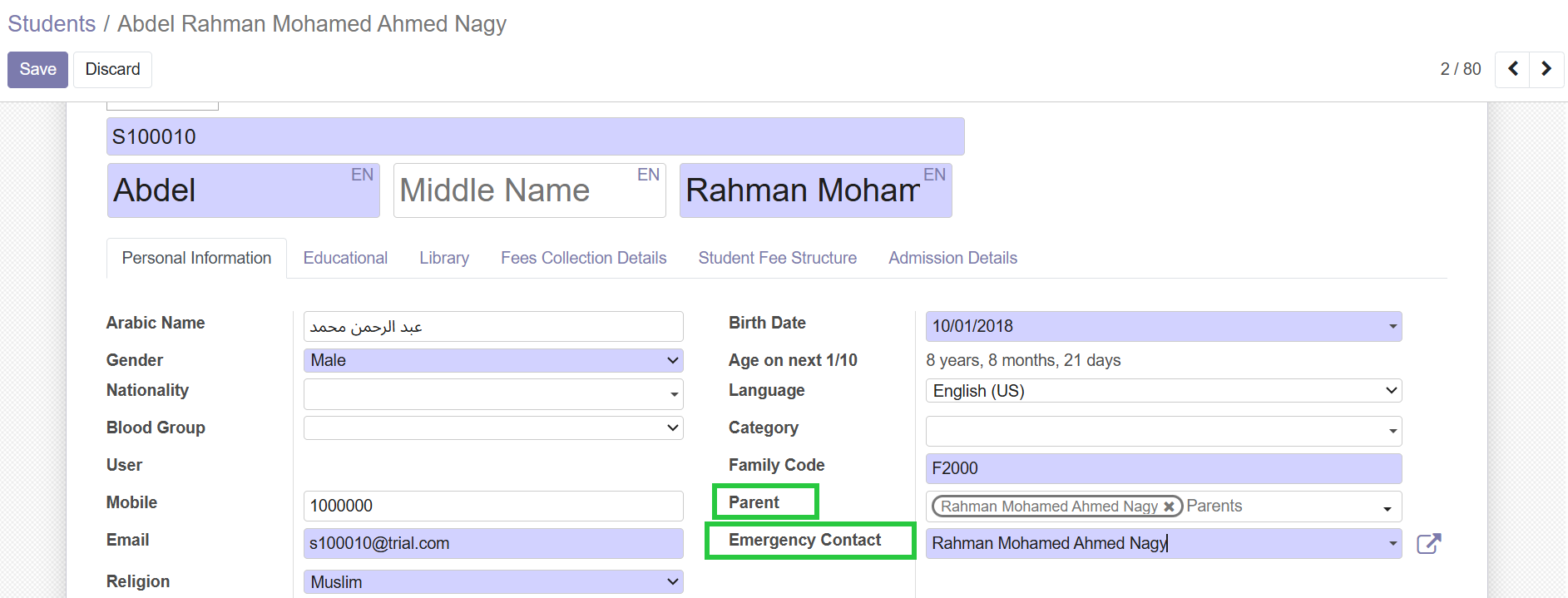 Note: If the parent is old one we choose his/her name from the parent list and also choose the emergency contact from the emergency contact list