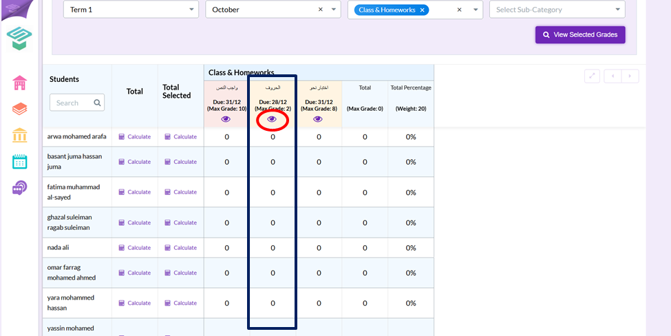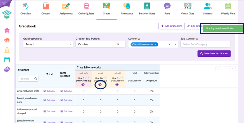 Step4: Press the Eye button on the top of the required column to hide its grades