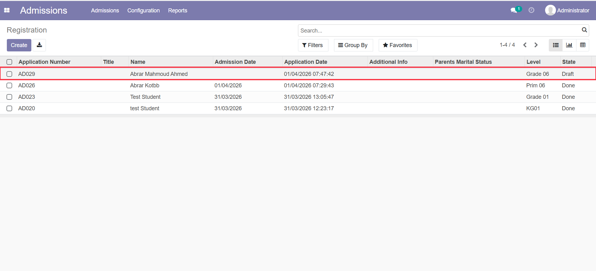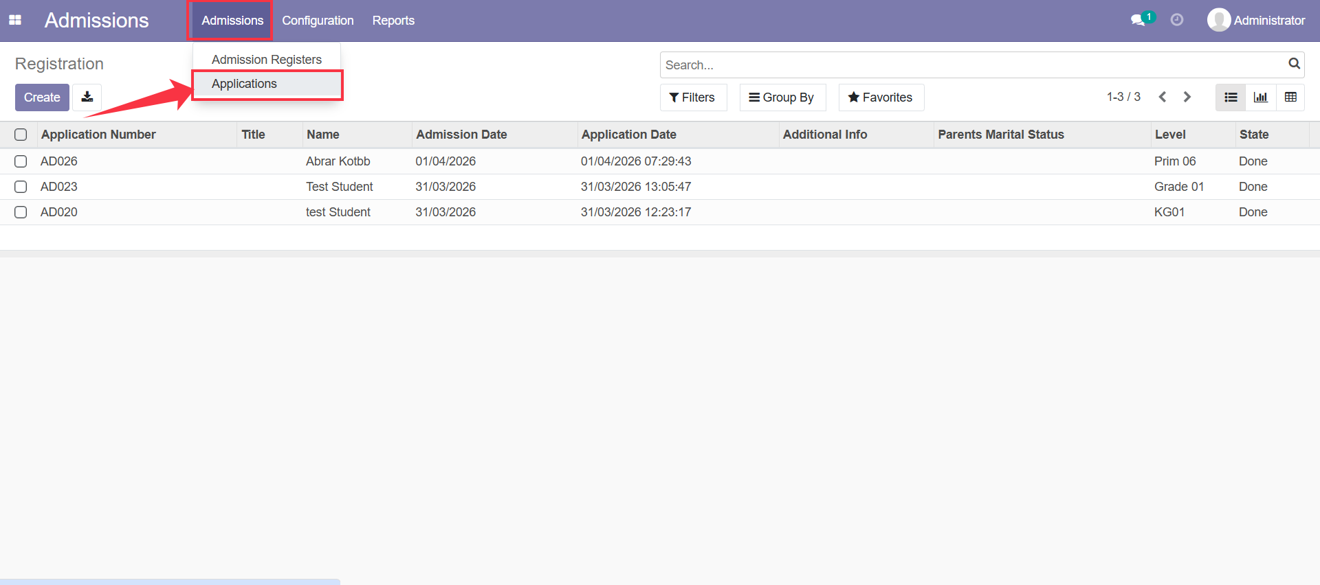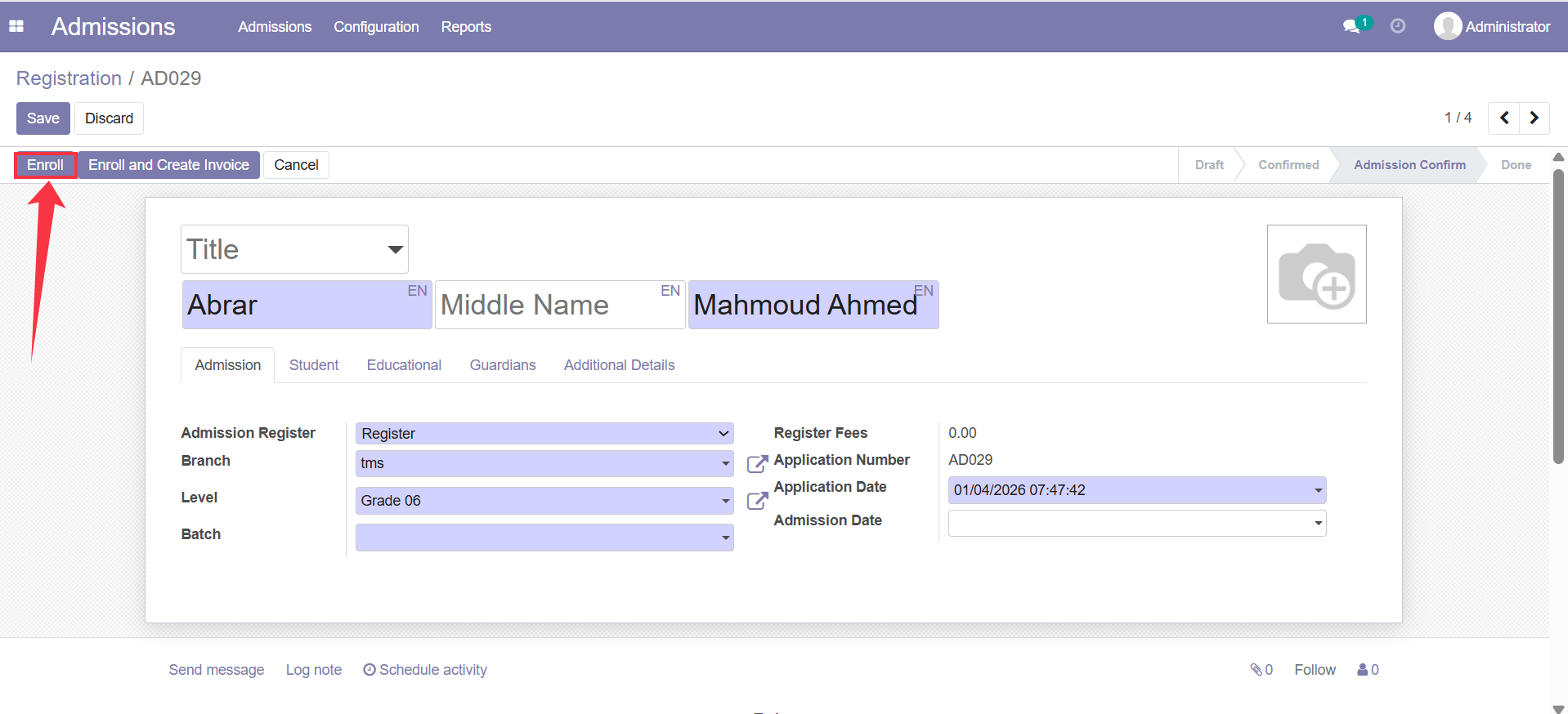 This article explains how to process and enroll a student application in Odoo 14 through the Admissions module.